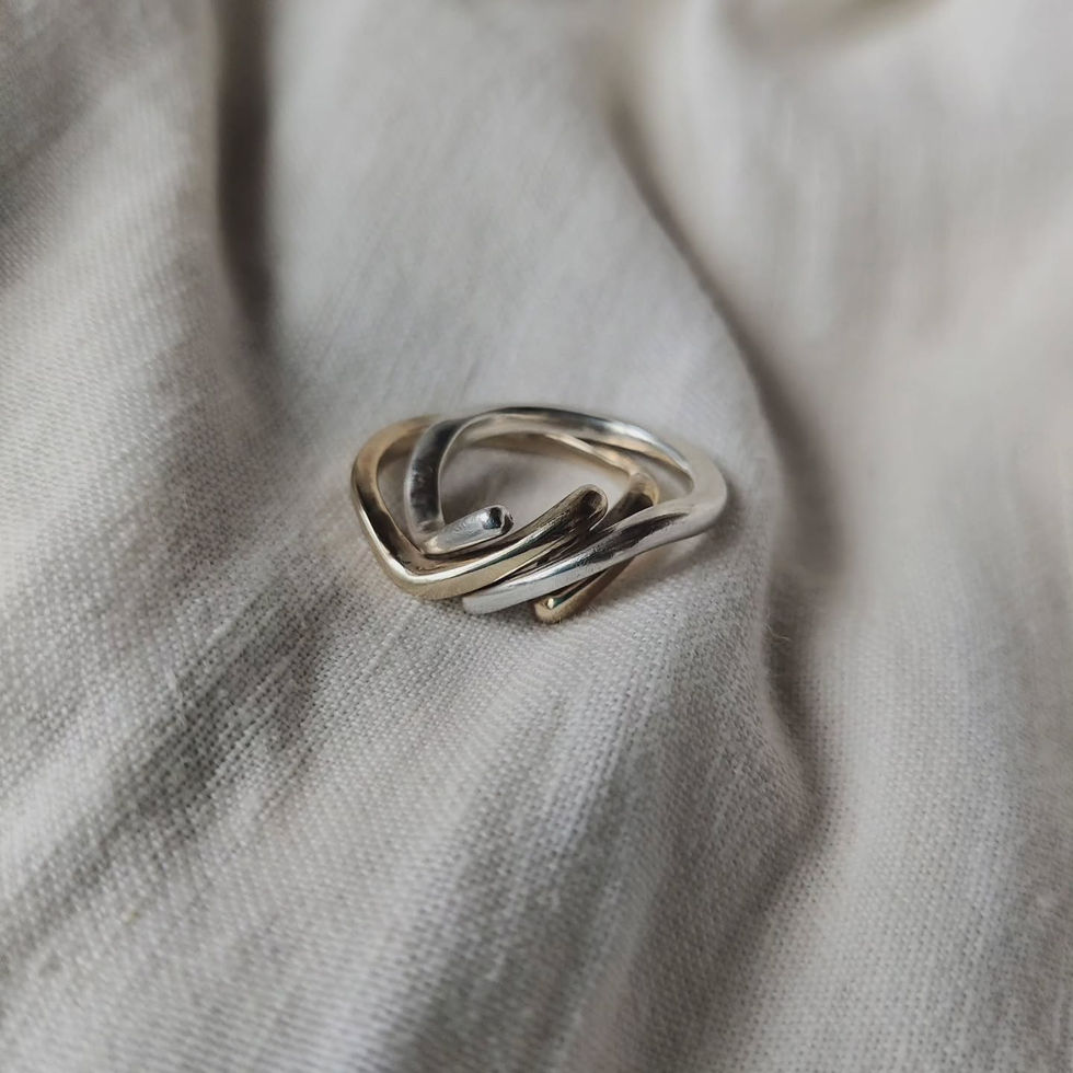 14k gouden ring gecombineerd met een sterling zilveren ring die als puzzelstukjes in elkaar vallen.